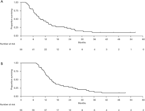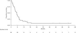 Median follow-up from start of maintenance chemotherapy was 45.5 months [95% confidence interval (95% CI), 22.6–NA]. Forty-nine patients experienced either disease progression or death from any cause. Median PFS was 5.4 months (95% CI, 3.7–6.3) (Figure 1). At three, six, and 12 months, 76.4%, 41.5%, and 17.0% were free of progression, respectively. In an exploratory analysis, there was no difference in median PFS between patients treated with FOLFOX or FOLFIRI as maintenance chemotherapy (FOLFOX: 6.2 months, 95% CI, 1.9–7.4; FOLFIRI: 5.2 months, 95% CI, 3.6–6.3; P=0.98).