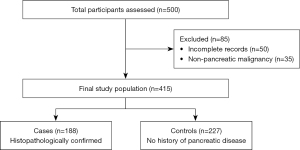The study included 415 participants, comprising 188 confirmed cases of PC and 227 control subjects. The case group included patients with a confirmed histopathological diagnosis of PC, complete medical records, and a recent diagnosis within the study period. Histopathological confirmation was based on the World Health Organization (WHO) Classification of Tumors of the Digestive System and national pathology guidelines (18).